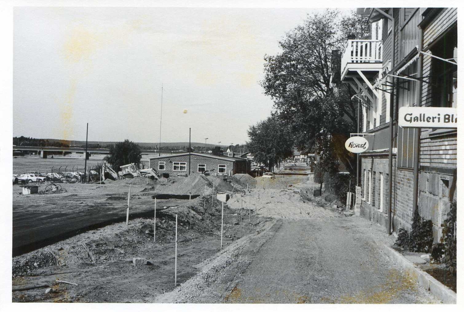 I juni 1974 pågick arbetet med Kyrkbron för fullt och bygget präglade älvstranden och stadsvyn i centrala Umeå. Betongpelare reste sig ur Umeälven och byggkranar dominerade landskapet, medan arbetare utförde gjutningar och montage.