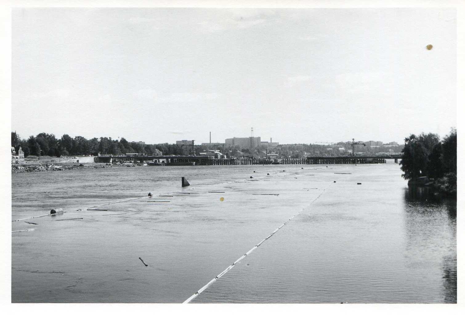I juni 1974 pågick arbetet med Kyrkbron för fullt och bygget präglade älvstranden och stadsvyn i centrala Umeå. Betongpelare reste sig ur Umeälven och byggkranar dominerade landskapet, medan arbetare utförde gjutningar och montage.
